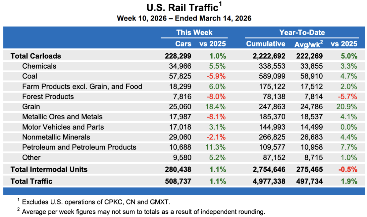 Total combined traffic was 699,037 carloads and intermodal units, up 0.5%. Volume for the first 10 weeks of this year totaled 6,849,595 carloads and intermodal units, an increase of 2.4% compared with 2025.