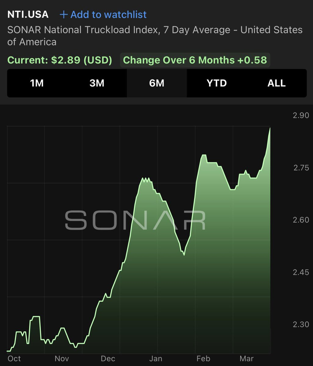 The freight market momentum is building at a rapid clip. National dry van spot rates — tracked via the SONAR National Truckload Index (NTI.USA), the 7-day moving average of booked rates including fuel — have broken out to a new cycle high of $2.89 per mile. This represents the strongest level since 2022 and confirms the market’s shift toward carriers is gaining real traction.