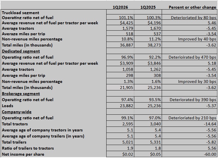 For Marten’s (NASDAQ: MRTN) truckload segment, the OR net of fuel in the first quarter of 2026 was 101.1%. A year ago it was 100.3%; in the fourth quarter of 2025 it was 99.1%.