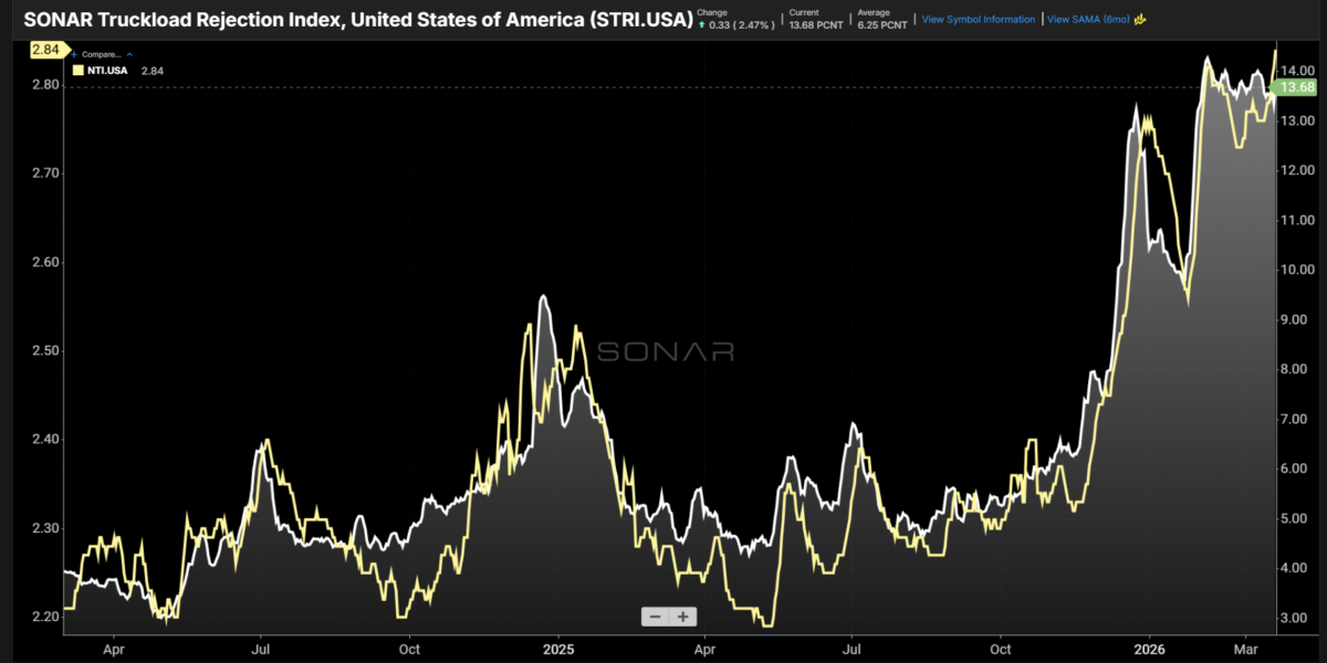 Chart of the Week:  SONAR Truckload Rejection Index, National Truckload Index – USA SONARSTRI.USA, NTI.USA