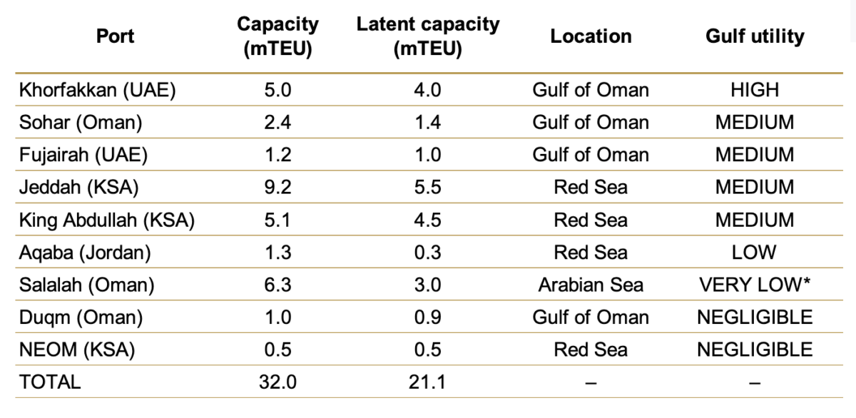Drewry’s assessment of the Gulf Cooperation Council’s principal bypass ports found a collective latent container capacity of over 20 million TEUs, a substantial figure that is nonetheless heavily constrained by geography and logistics.